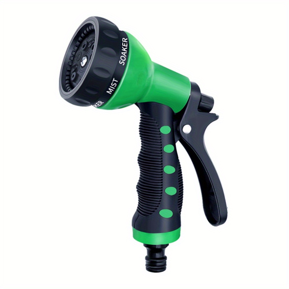 Multi-function 8-pattern garden hose spray gun designed for watering plants, lawn irrigation, car washing, and outdoor cleaning. Features an adjustable spray nozzle, ergonomic soft grip hose nozzle, and durable plastic nozzle construction with multiple spray modes for versatile garden and household use.