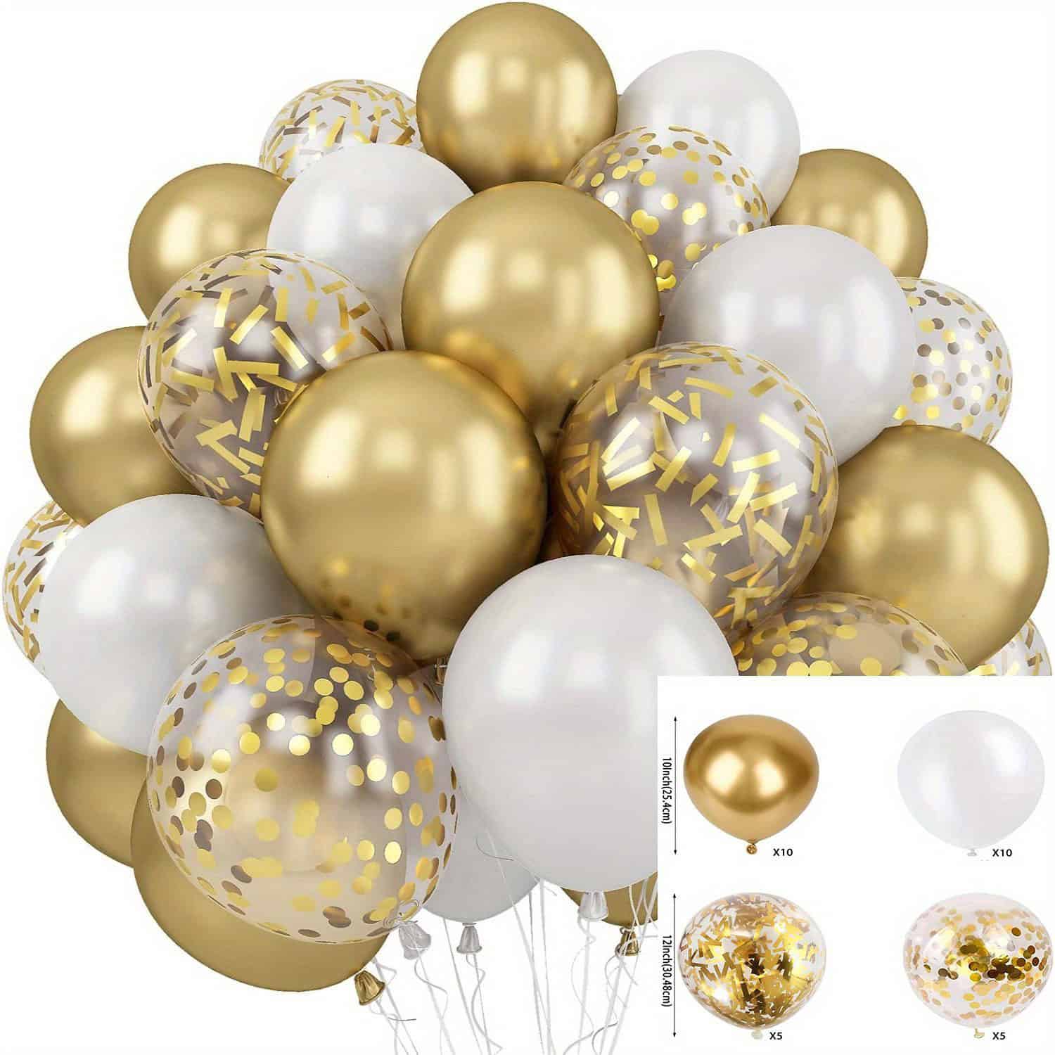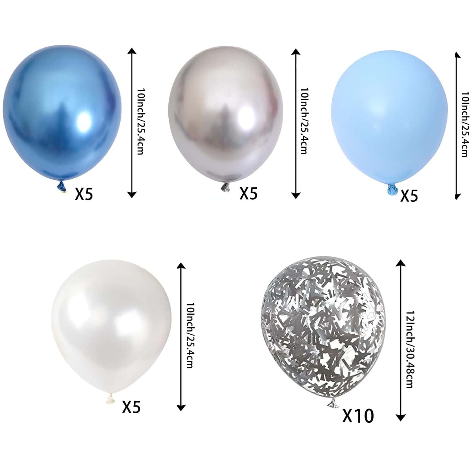 This metallic balloon set includes a beautiful combination of gold, blue, silver, and pearl white balloons, along with eye-catching confetti balloons. It adds a stylish and festive touch to any celebration.